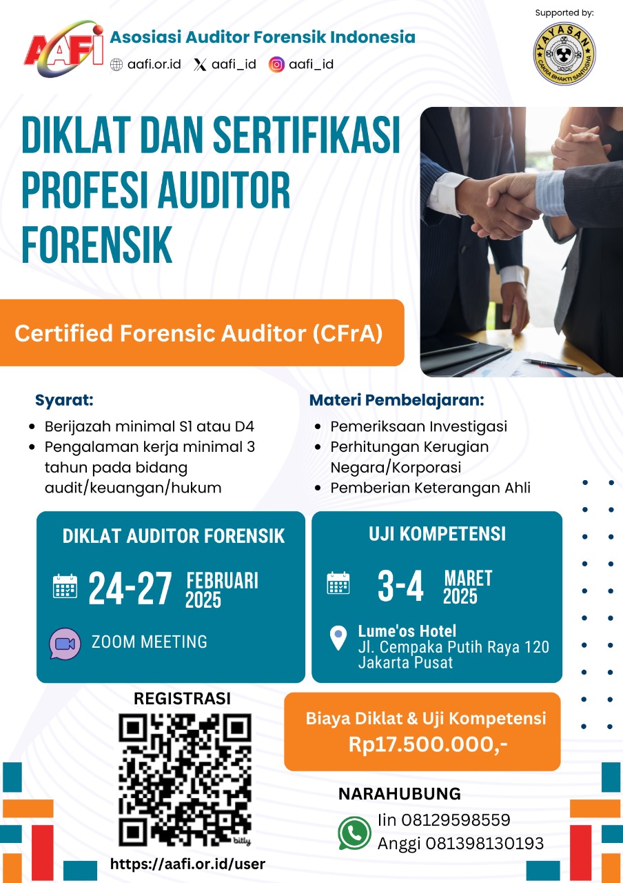 Asosiasi Auditor Forensik Indonesia Wuarem (AAFI WUAREM), dengan dukungan dari Yayasan Cakra Bhakti Santosha, kembali mengadakan Diklat dan Sertifikasi Profesi Auditor Forensik dengan gelar Certified Forensic Auditor (CFrA). Program ini bertujuan untuk meningkatkan kompetensi para auditor dalam bidang audit investigatif dan forensik guna mendukung upaya pemberantasan tindak pidana keuangan dan korupsi.