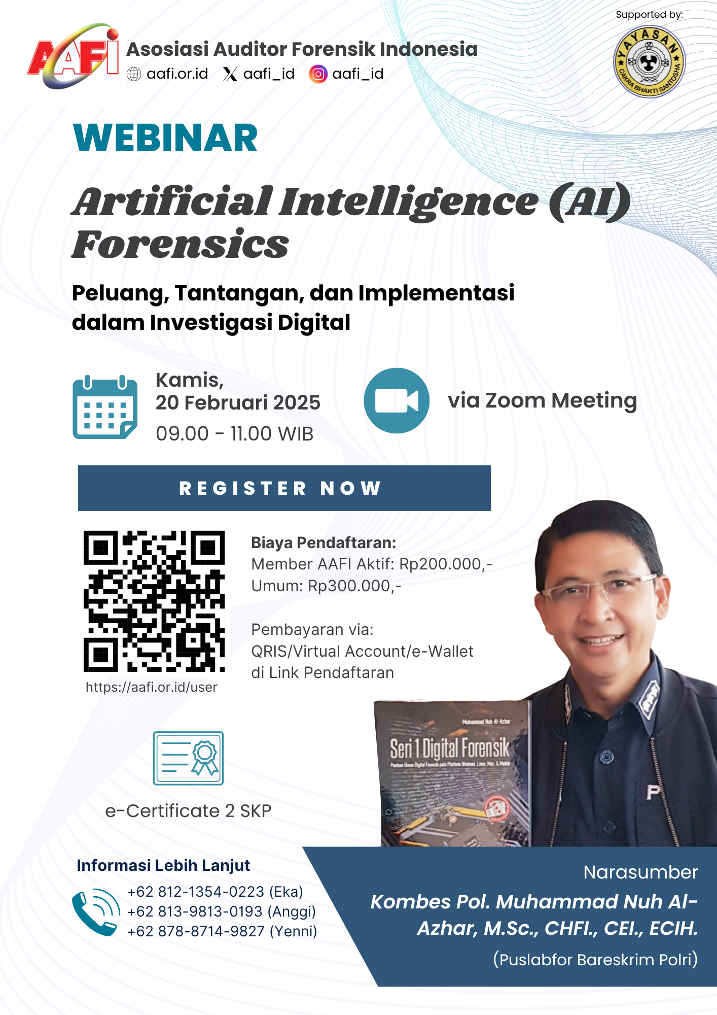 Untuk menjawab pertanyaan-pertanyaan ini, Asosiasi Auditor Forensik Indonesia Wuarem (AAFI WUAREM), dengan dukungan dari Yayasan Cakra Bhakti Santosha, mengadakan webinar bertema "Artificial Intelligence (AI) Forensics".
