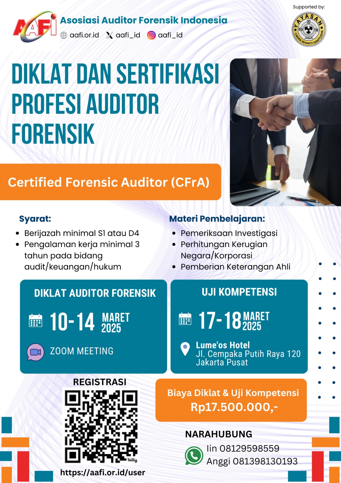 Asosiasi Auditor Forensik Indonesia Wuarem (AAFI WUAREM), dengan dukungan dari Yayasan Cakra Bhakti Santosha, kembali mengadakan Diklat dan Sertifikasi Profesi Auditor Forensik dengan gelar Certified Forensic Auditor (CFrA). Program ini bertujuan untuk meningkatkan kompetensi para auditor dalam bidang audit investigatif dan forensik guna mendukung upaya pemberantasan tindak pidana keuangan dan korupsi.